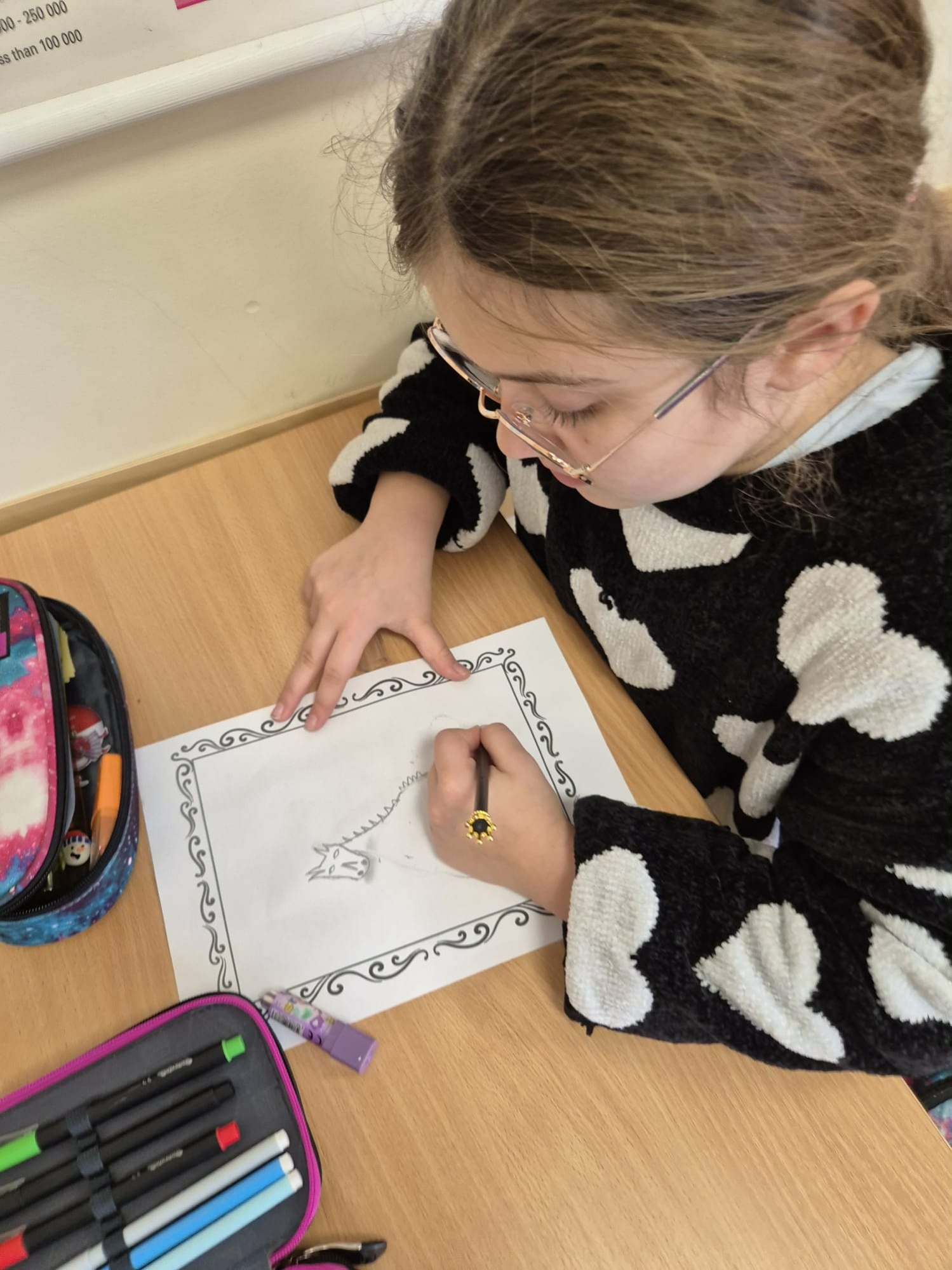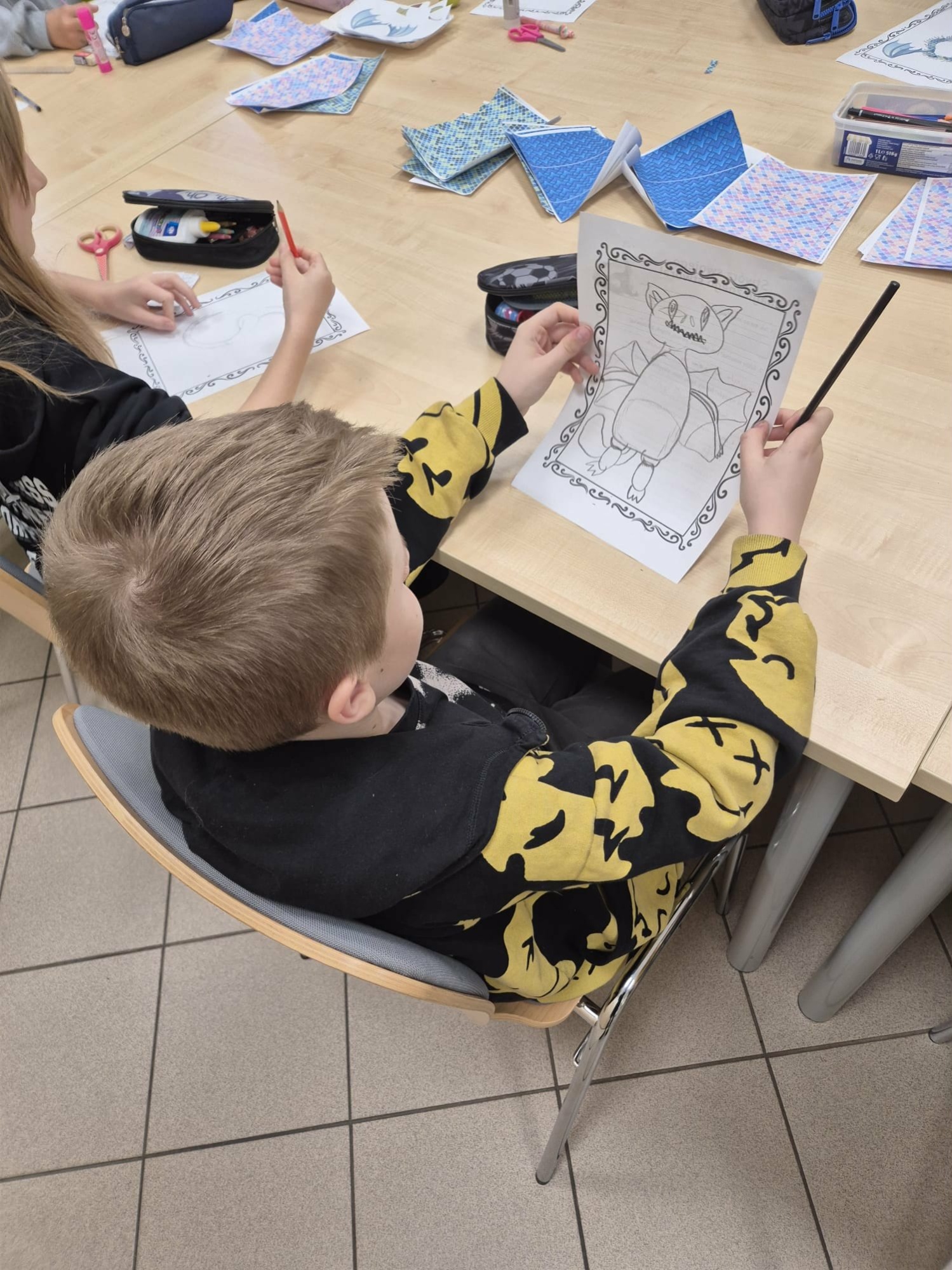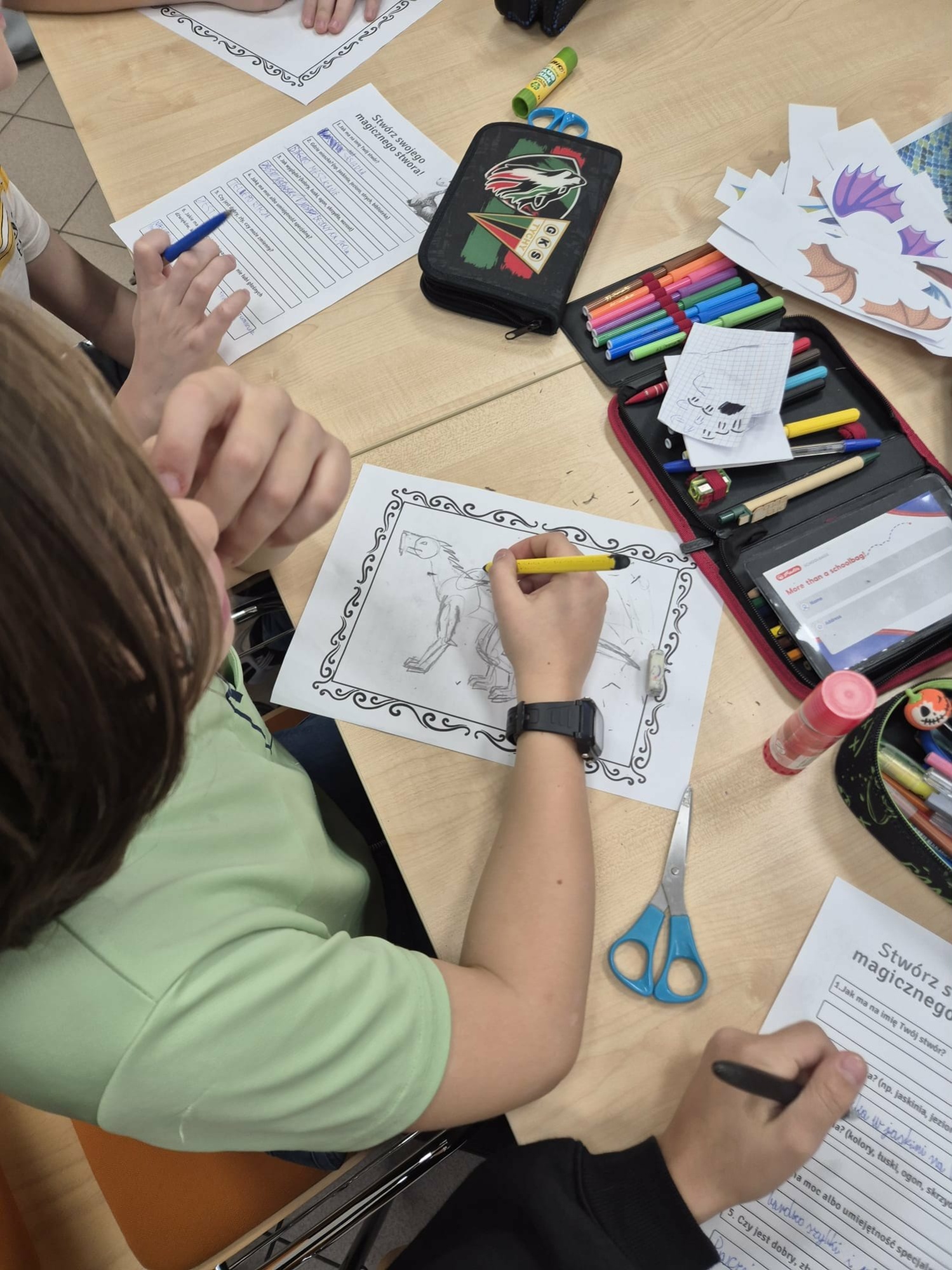 Następnie dzieci zaprojektowały własne, niepowtarzalne istoty magiczne. Efektem ich pracy stał się klasowy bestiariusz – niezwykła kolekcja rysunków i opisów fantastycznych stworzeń.